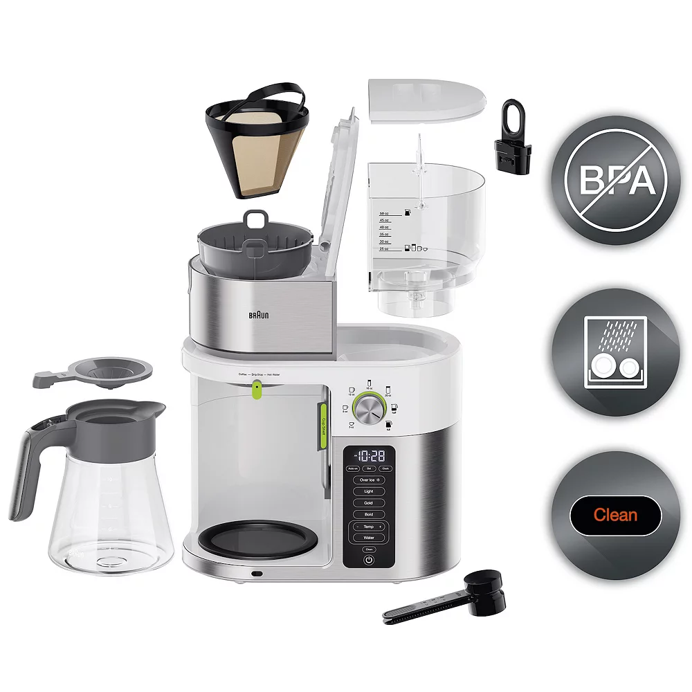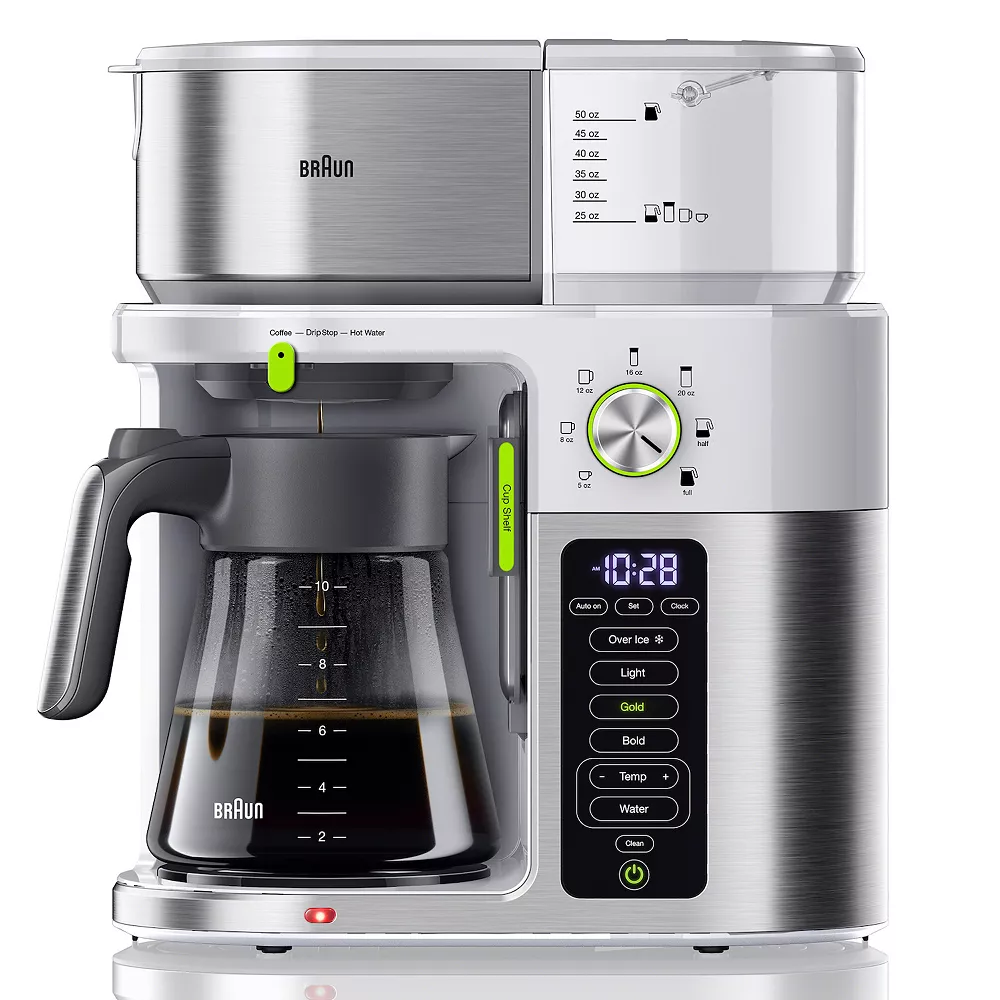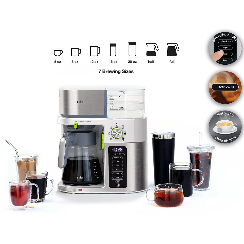 From single-serve to multi-serve and everything in between, the Braun MultiServe Coffee Maker in a sleek stainless steel and white accent design easily adapts to your ever changing needs and coffee preferences.