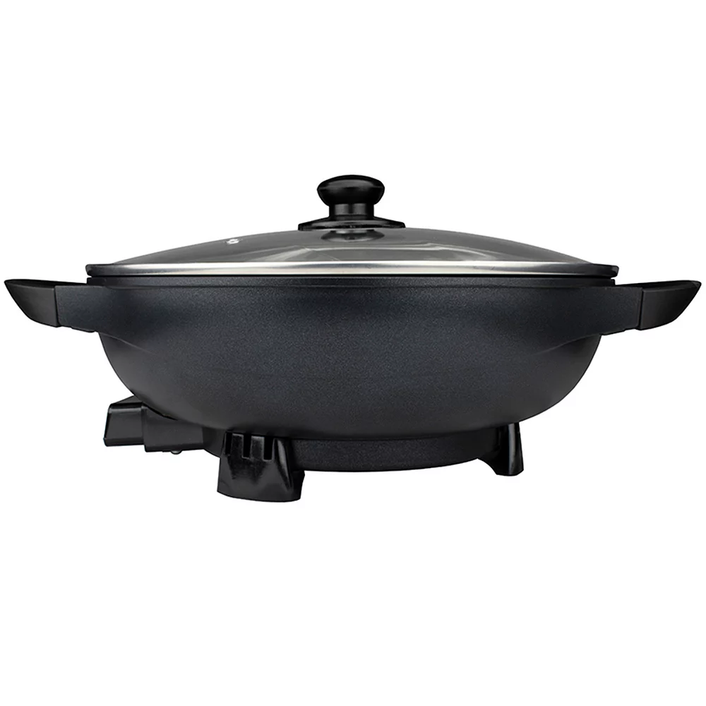 The Brentwood 13in Non-Stick Flat Bottom Electric Wok Skillet has a powerful 1400Watt strength and is perfect for stir fry and more. Featuring an adjustable and removable thermostat, cool touch handles, and an easy to clean non-stick surface. This electric wok has perfect countertop capability and allows you to conveniently cook an all in one meal without having to dirty other dishes. Cool touch handles make it easily portable even when hot and adjustable temperature from 195-450 degrees F allows you to cook a wide range of foods.