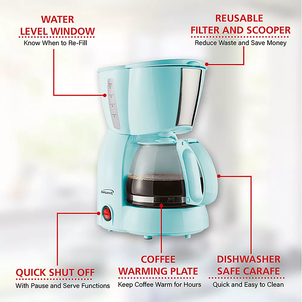 Use the Brentwood 4 Cup Coffee Maker to make the perfect pot of coffee. Simply place your grounds, add water and hit the power button. Warming plate keeps coffee hot. Save money with the reusable filter basket. Unit is BPA Free and easy to clean. The Compact size is perfect for home kitchen counter tops, break rooms, office spaces and college dorms.