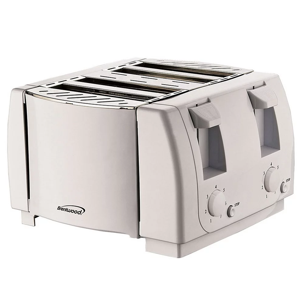 Use the powerful 1300 watt brentwood cool touch 4 slice toaster to save time in the morning when preparing breakfast for the family. Choose level of toast with 7 setting, light to dark dials. Auto centering guides insure even toasting. Individually cancel each toasting cycle using the cancel buttons. Right and left side crumb trays are located on the bottom of the toaster. Sleek white toaster with stainless steel accents looks great on any kitchen counter. Family size 4 slice toaster, cool touch body for added safety, auto-centering guides insure even toasting, enjoy light to dark toast with 7-setting browning knobs, individually cancel toast cycles with cancel buttons, individual crumb trays located on bottom of toaster, sleek black toaster with stainless steel accents looks great on any kitchen counter, powerful 1300 watts.