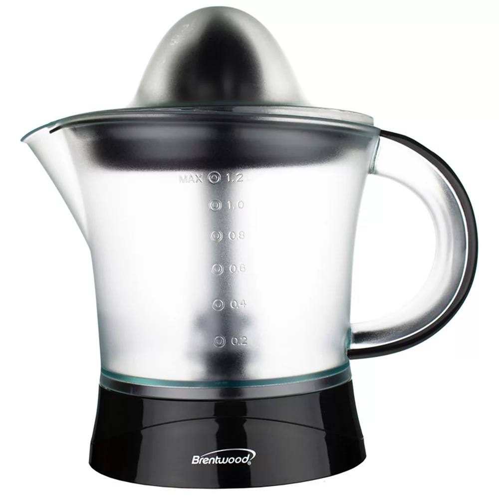 The Brentwood 40oz Electric Citrus Juicer in Black helps you to easily make fresh juice right at home! With 25 Watts of power you can juice oranges, lemons, limes and more. The self-reversing cone extracts the maximum amount of juice to reduce waste and get the most out of your fruit. The clear pitcher lifts easily off the base for immediate serving and easy clean up. Dishwasher safe removable parts.