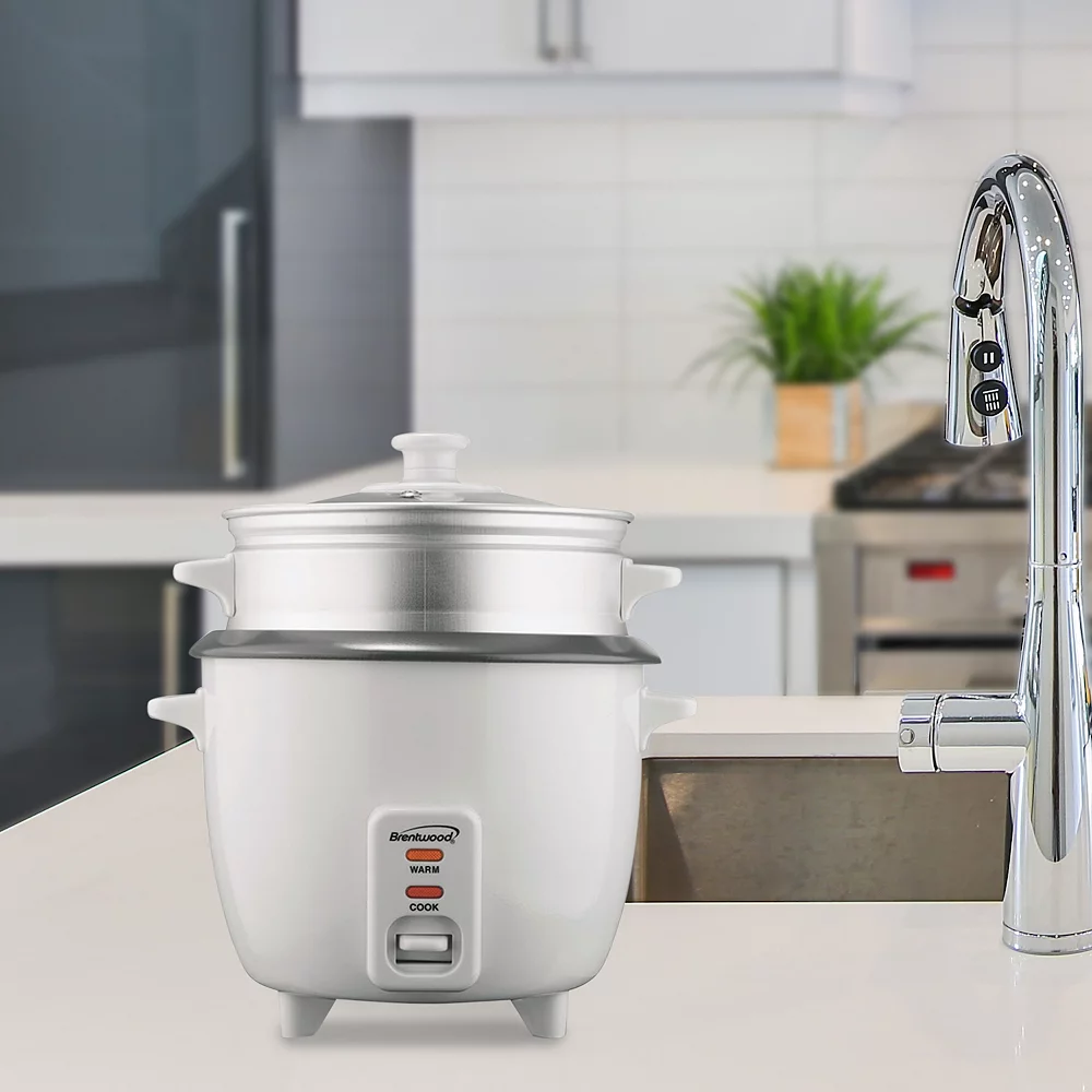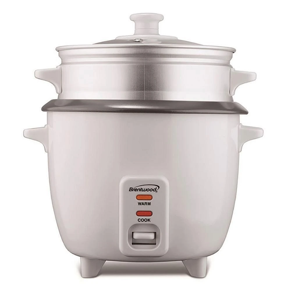 The powerful 400w Brentwood 5-Cup Uncooked/ 10-Cup Cooked Rice Cooker and Food Steamer steams meats and veggies while rice cooks. Heat chili, soups and more. Features one touch operation with auto warming. Features removable, non-stick pot and cool touch handles. Includes measuring cup and serving paddle, just add your ingredients.