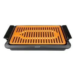 Use the powerful 1000 watt Brentwood Indoor Electric Copper Grill to cook all your favorite foods indoors without any smoke. Powerful watts with adjustable temperature allows you to grill slow all the way up to searing high. The removable non-stick copper grill simply wipes down clean and the removable drip tray is dishwasher safe. As you cook on the open grill watch fat and grease drip away leaving a much leaner and healthier protein. Use the grill for steak, chicken, fish, veggies and more. Black body and copper finished grill looks great on every countertop.