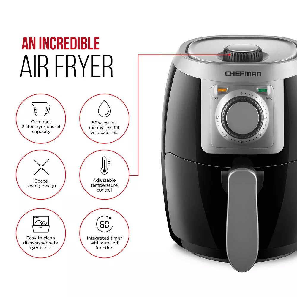 Compact size. Big flavor. With the latest advances in rapid-air technology, the Chefman air fryer circulates hot air at a high speed, cooking your favorite foods and producing a crispy fried texture with little or no oil.