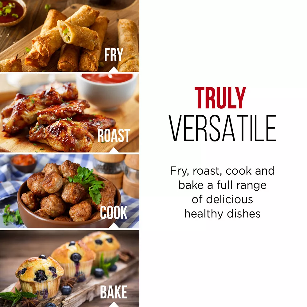- Temperature range from 200°F – 400°F allows you to cook at your desired temperature, achieving a healthy, crispy, fried finish using at least 98% less oil than traditional fryers.