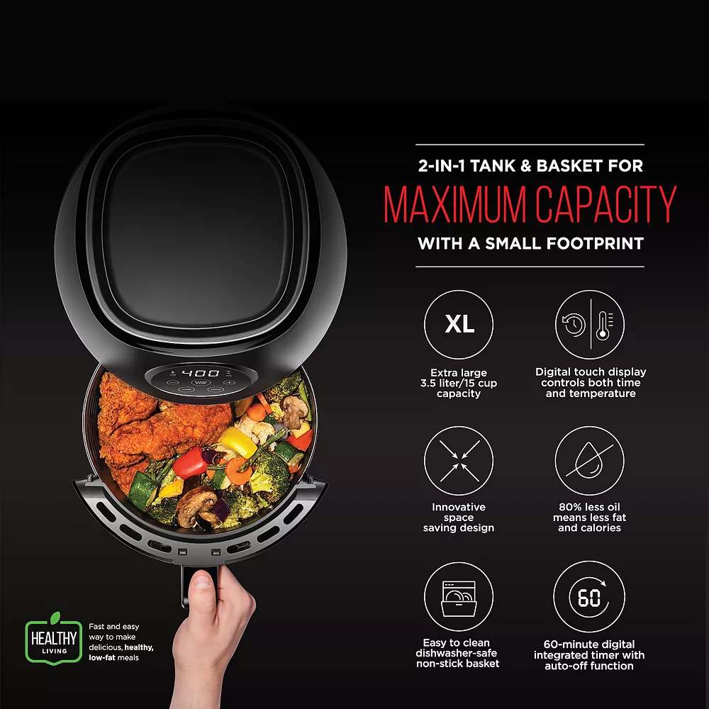 - A sleek, rounded shape and matte black finish earns this air fryer a prime spot on countertops- all while remaining compact and easy to store. Its flat basket design holds 40% more food than traditional air fryer baskets without any unsightly bulkiness.