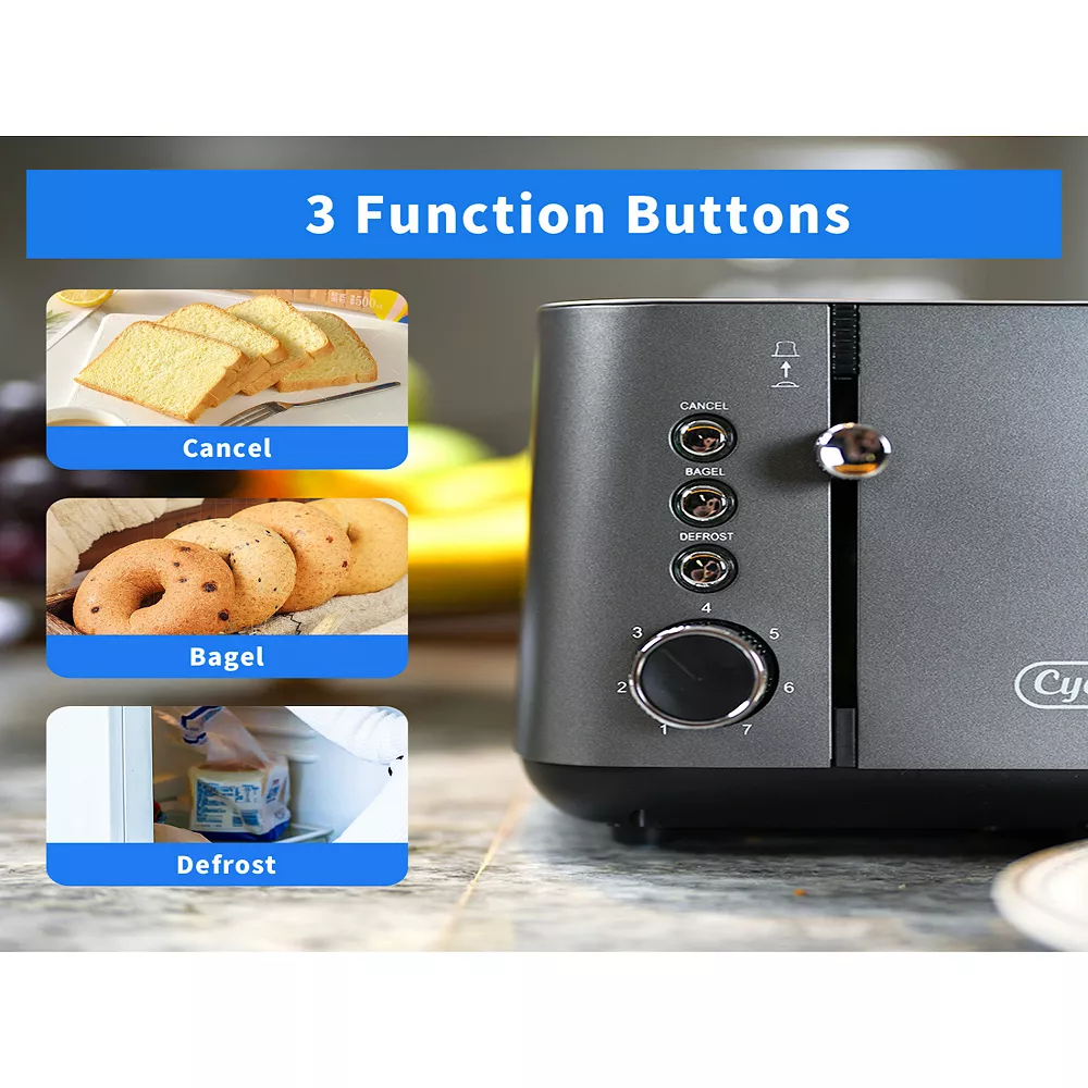 Start your mornings off right with the 4-Slot Stainless Steel Toaster from Cyetus. This toaster uses high-end stainless material to deliver a long-time high temperature without deforming the toaster. Internally, the toaster heats two-ways so that every slice of bread will have the same shade and a uniform heat. There are four extra-wide slots, with each two being controlled by an independent control panel. The 1.5 inch wide slots allow for all different types of breads, including bagels, waffles, and even thick artisanal bread. Use one control panel at a time or use both to feed the whole family at once. The solid high lift lever lifts the food one centimeter higher than usual to make removing bread easier. It is equipped with a crumb tray to easily collect fallen bread crumbs for a convenient cleanup experience. Set this toaster to your preference with the nine shade settings that will let you choose between a lightly golden cook to a deep dark burn. For the perfect slice of bread every single time, use the Cyetus 4-Slot Stainless Steel Toaster.
