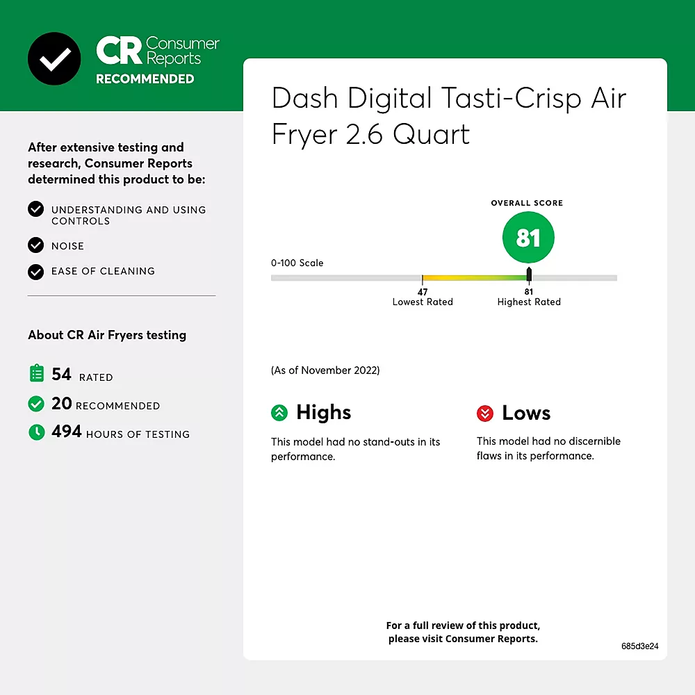 Cook crispy fried food in a dash with the Dash Tasti-Crisp Express Digital Air Fryer. AirCrisp Technology fries with hot air instead of oil, for tasty fried food with up to 75% less fat than a traditional deep fryer.