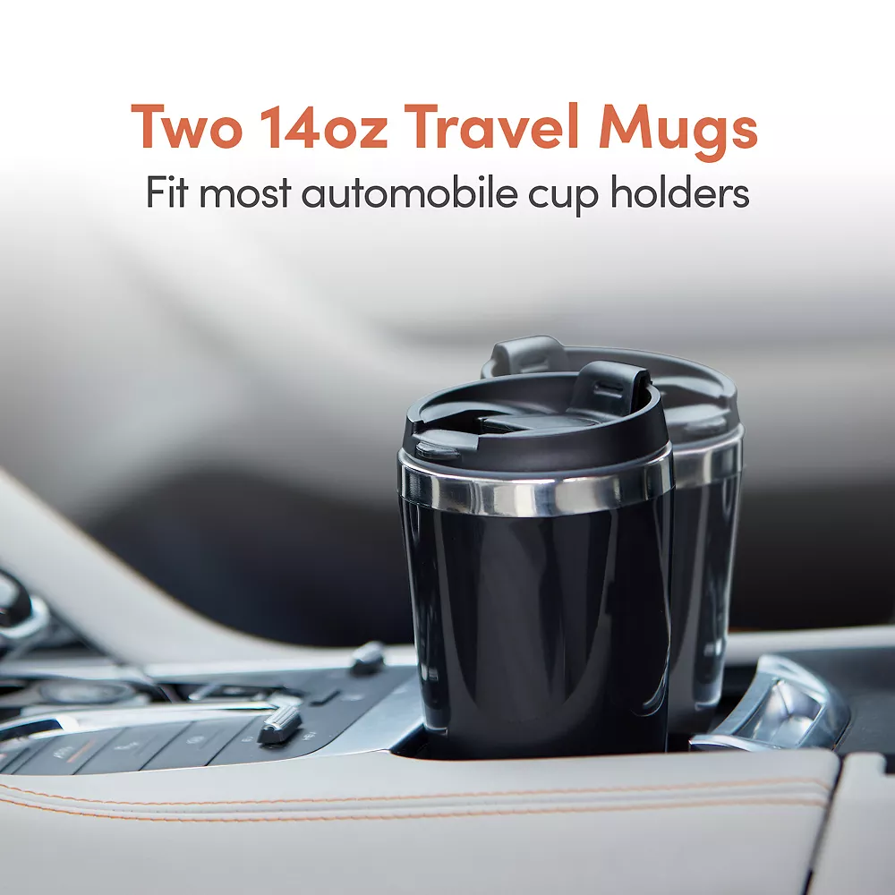 - Coffee maker, reusable filter, drip tray & two thermal insulated travel mugs with stainless steel interior