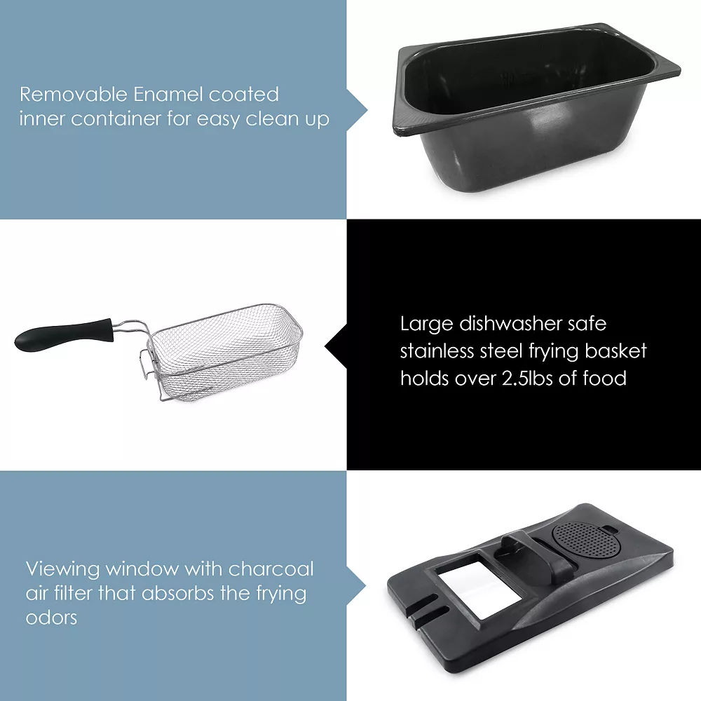 - Removable enamel nonstick oil tank and heating elements make cleanup easy.