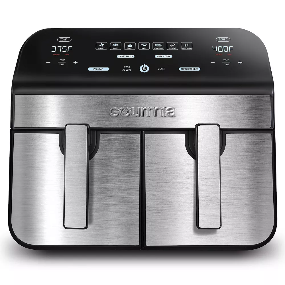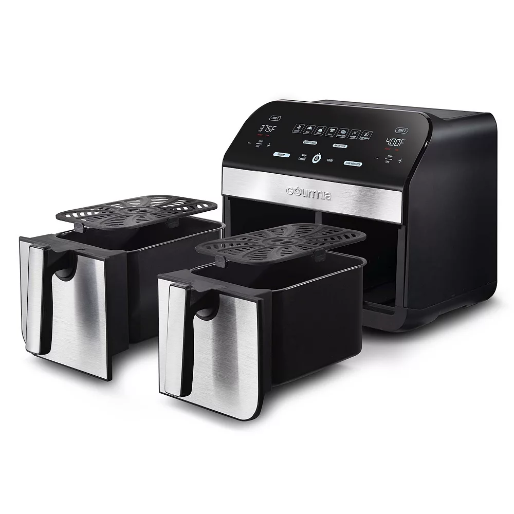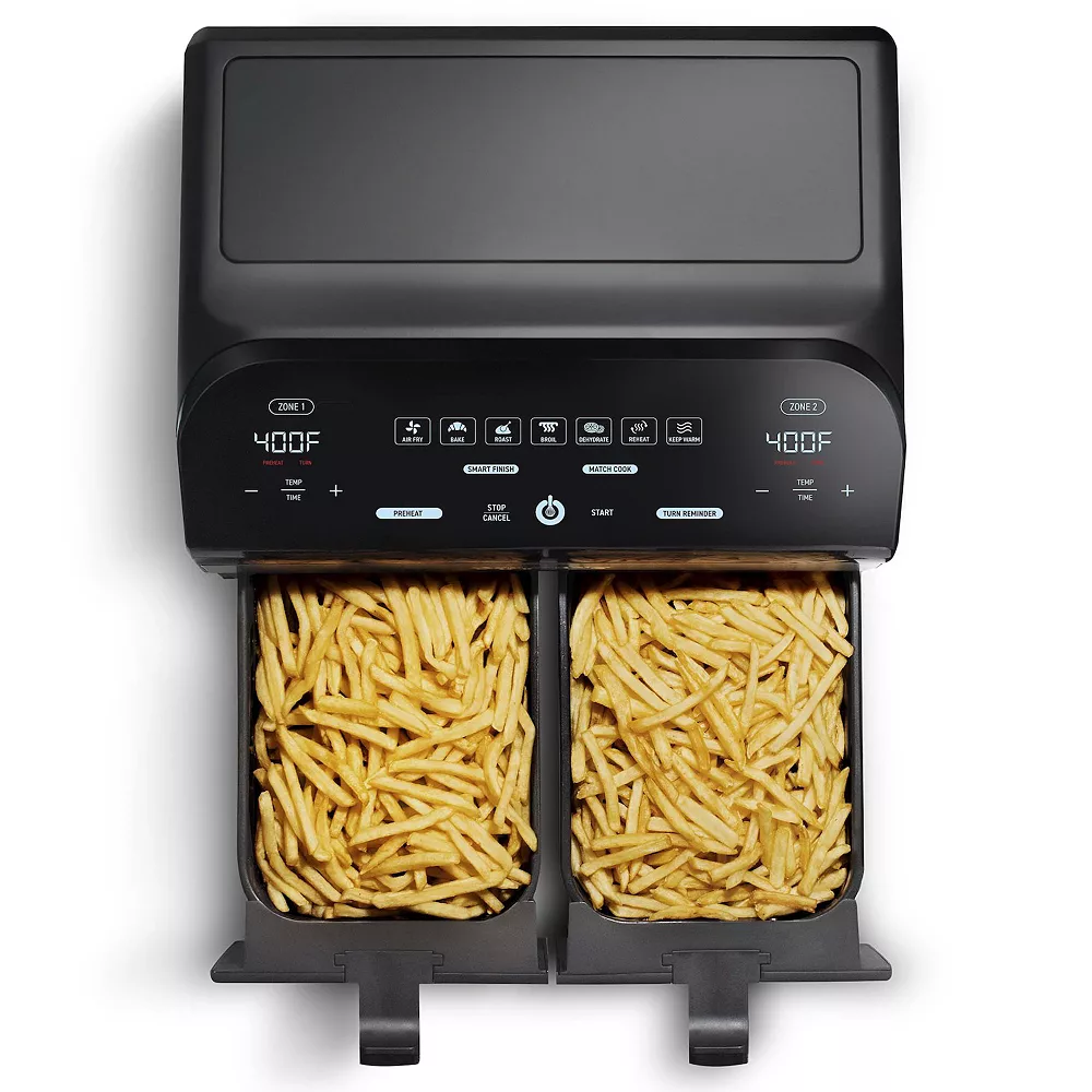Air fry to crispy perfection without a drop of fatty oil, thanks to the Gourmia dual air fryer. Two baskets let you cook two foods at different temps and times while the Smart Finish feature syncs the finish time so both foods are ready together.