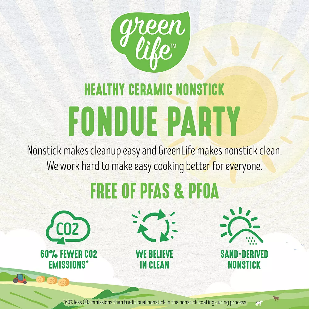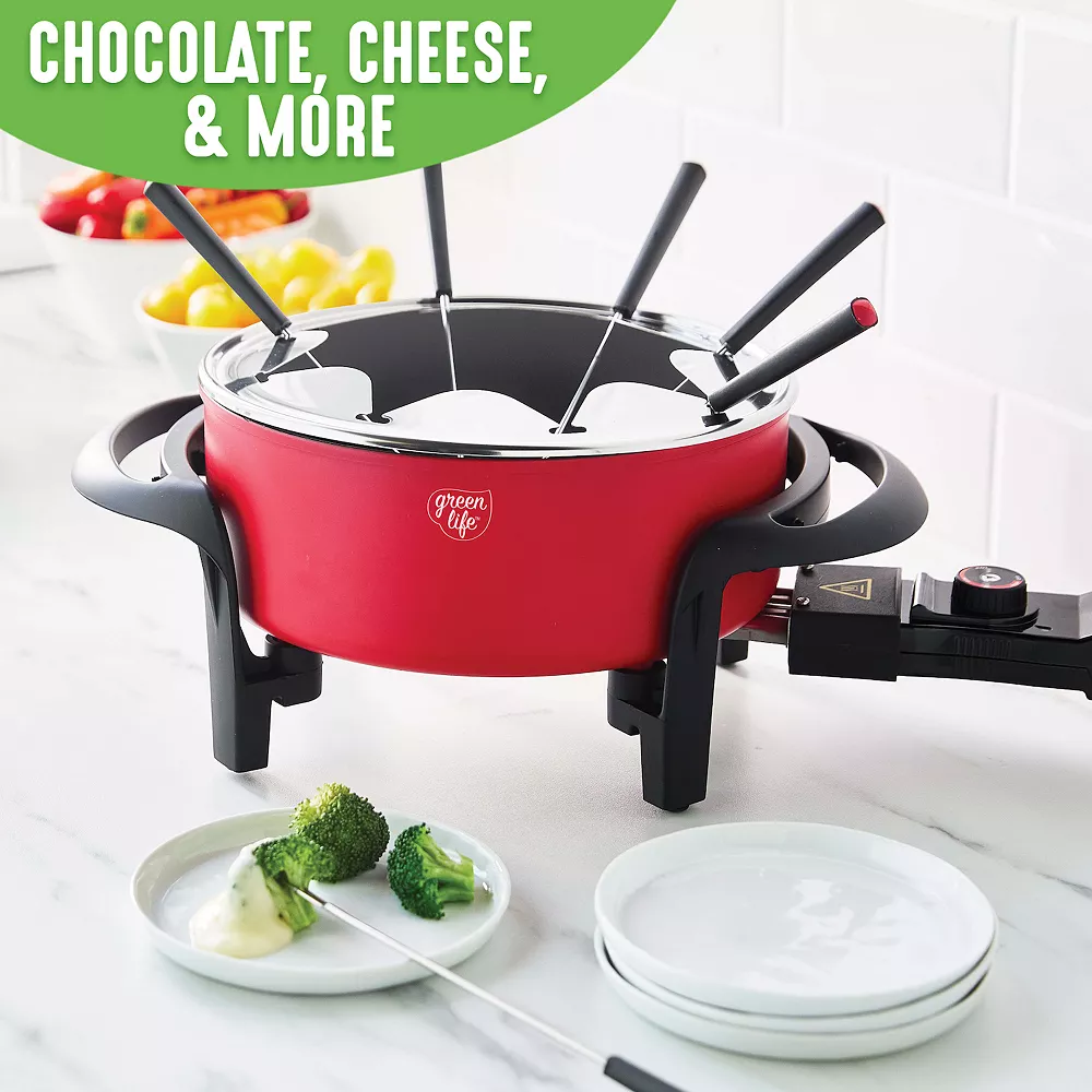 Fondue it together! The GreenLife Fondue Party Set with Color-Colded Forks makes it easy for people to get together and celebrate flavor. Everyone can gather to dunk a savory meat or a sweet dessert and create a delicious taste to define the night.