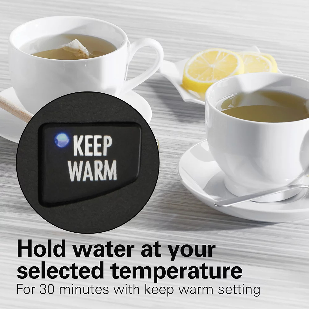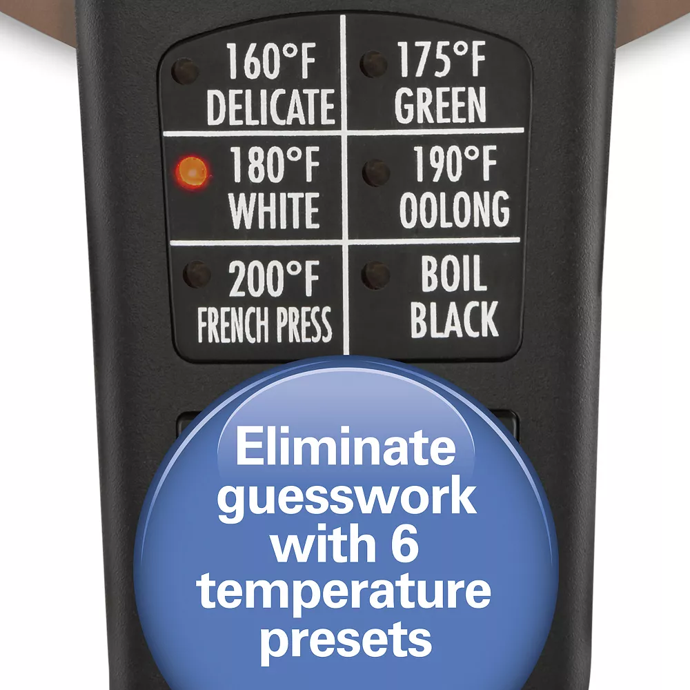 - Six temperature settings heat water precisely for different teas, French press coffee and hot cocoa