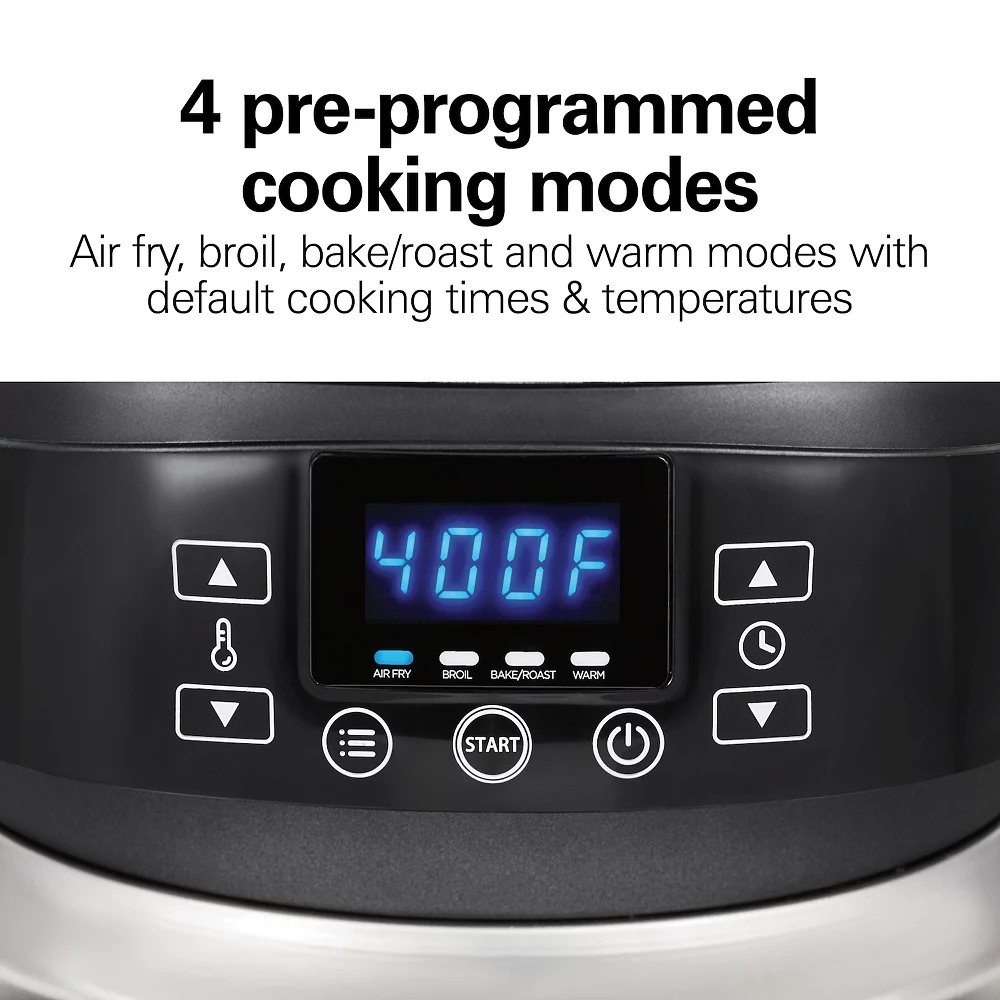 - Four pre-programmed cooking modes of this hot air fryer include air fry, broil, bake/roast and warm
