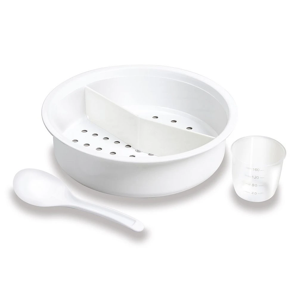 - Steaming basket with divider allows you to steam two different foods at the same time.