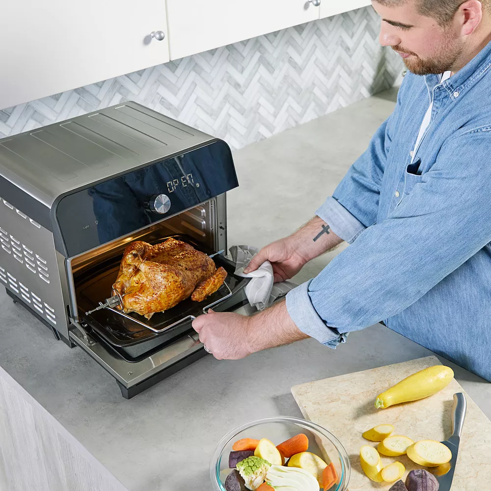 - 11 cooking functions in one: air fry, broil, bake, roast, dehydrate, reheat, rotisserie, toast, warm, convection