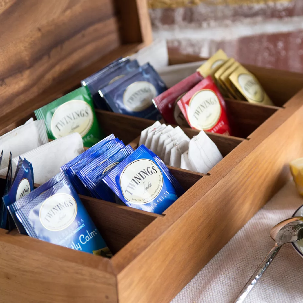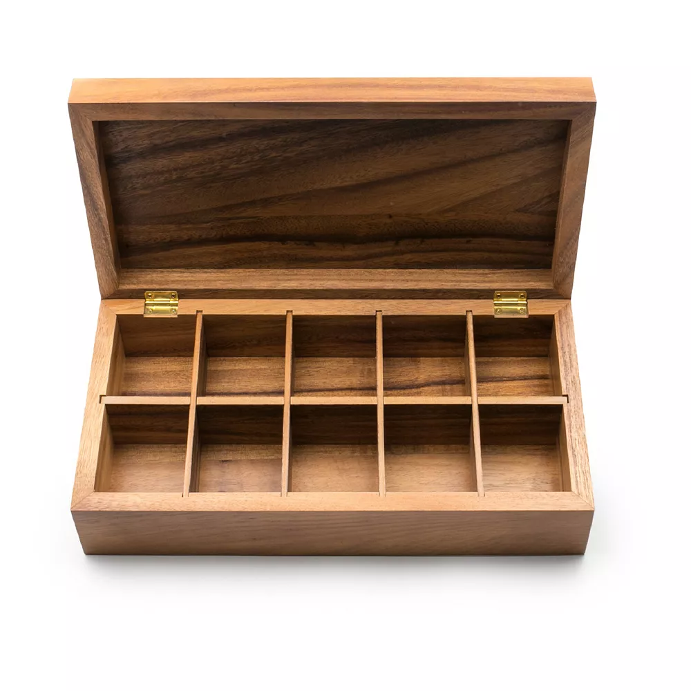 An elegant addition to your kitchen. This simple, yet sophisticated tea chest features a durable acacia wood construction — wonderful because each piece of wood has a slightly different, spectacular characteristic for a unique appearance. And its environmentally-friendly design also resists water and staining, so you get a storage piece that will last for years to come. With 10 different compartments, so you can conveniently store all your favorite teas, from Earl Grey to classic chamomile. Plus, a hinged top for easy closure. A great gift idea for the tea-lover!