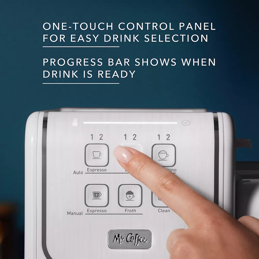 Make coffee-shop-quality drinks in the comfort of your home with the Mr. Coffee One-Touch CoffeeHouse+ Espresso, Cappuccino and Latte Maker. Its innovative, modern design and One-Touch interface let you brew, froth and create single or double shots of espresso, lattes and cappuccinos with one touch of a button.