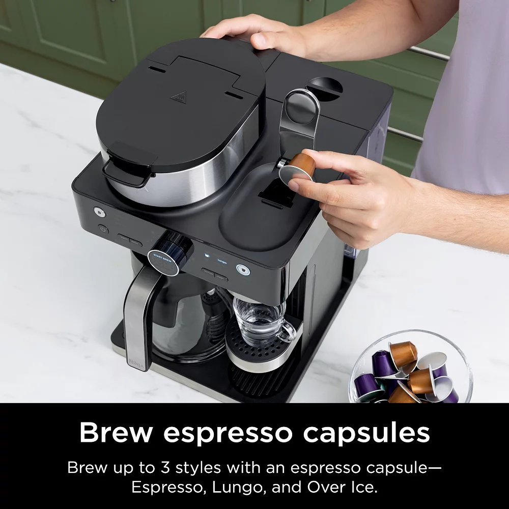 The Ninja Espresso & Coffee Barista System allows you to brew espresso capsules and coffee grounds. Brew a Classic, Rich or Iced Coffee from cup to carafe or brew an Espresso, Lungo or Iced espresso with your favorite capsules. Use the built-in, fold-away frother to create coffeehouse drinks.