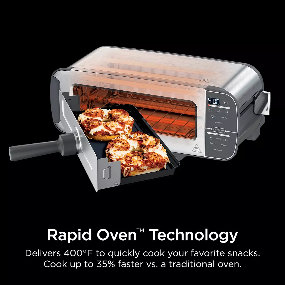 Meet the Ninja Foodi Flip Toaster, the flip toaster that bakes and broils. This 2-in-1 toaster and compact oven allows you to evenly toast 2 slices of thick-cut bread in toaster mode and quickly cook snacks in oven mode.