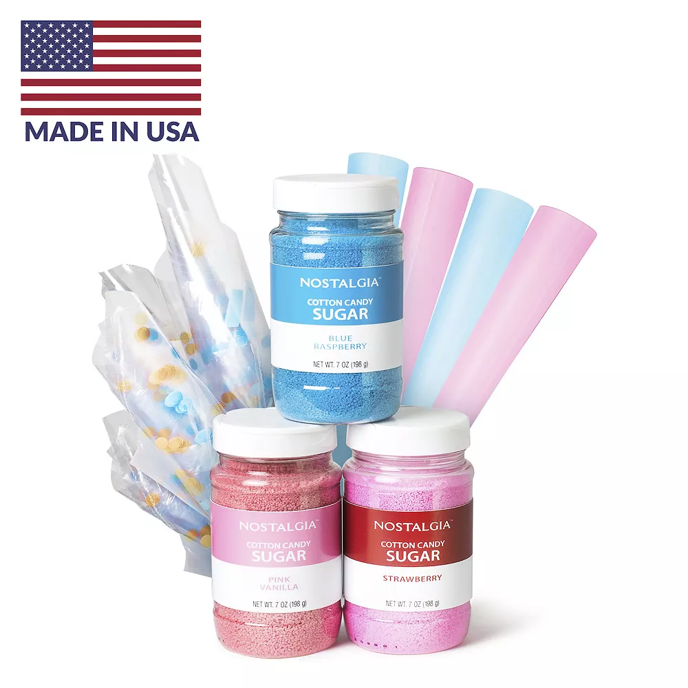 - 7-oz. jar of blue raspberry cotton candy flossing sugar, 7-oz. jar of pink vanilla cotton candy flossing sugar, 7-oz. jar of strawberry cotton candy flossing sugar, 4 reusable colored cones, 10 clear plastic bags & twist ties