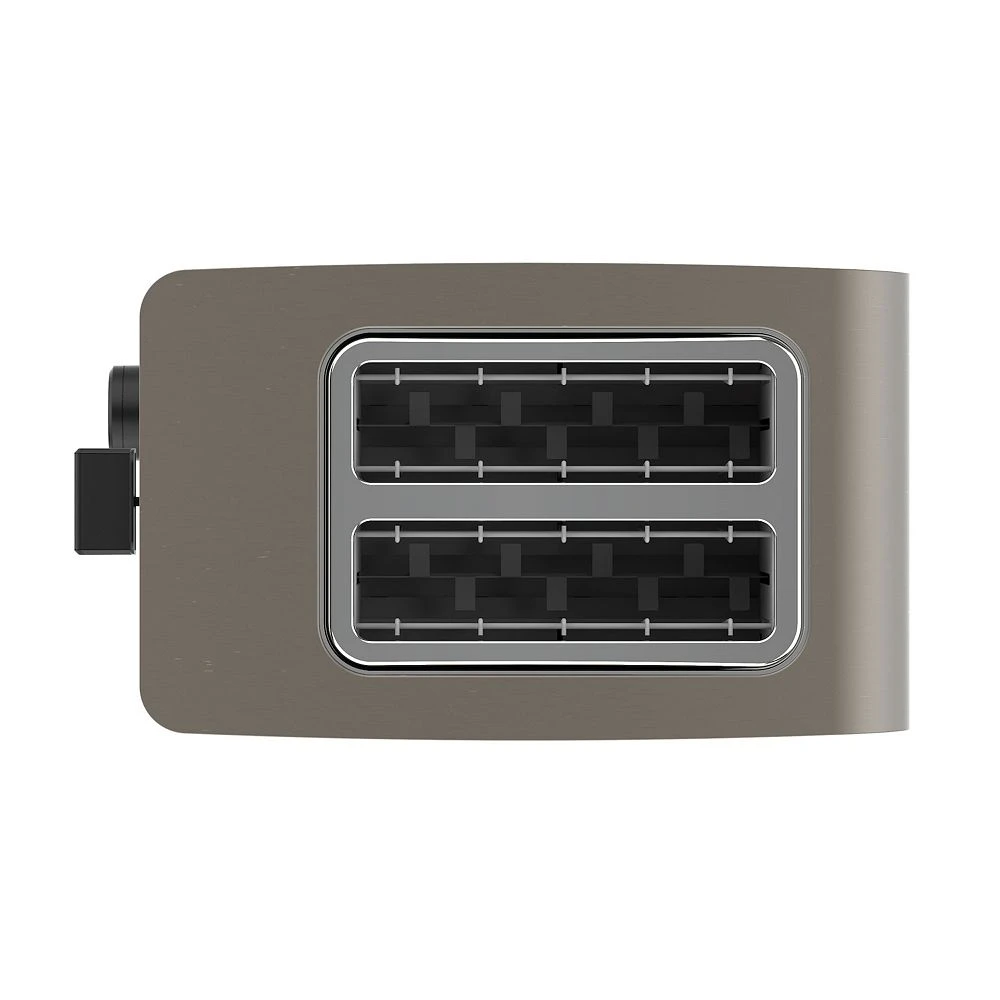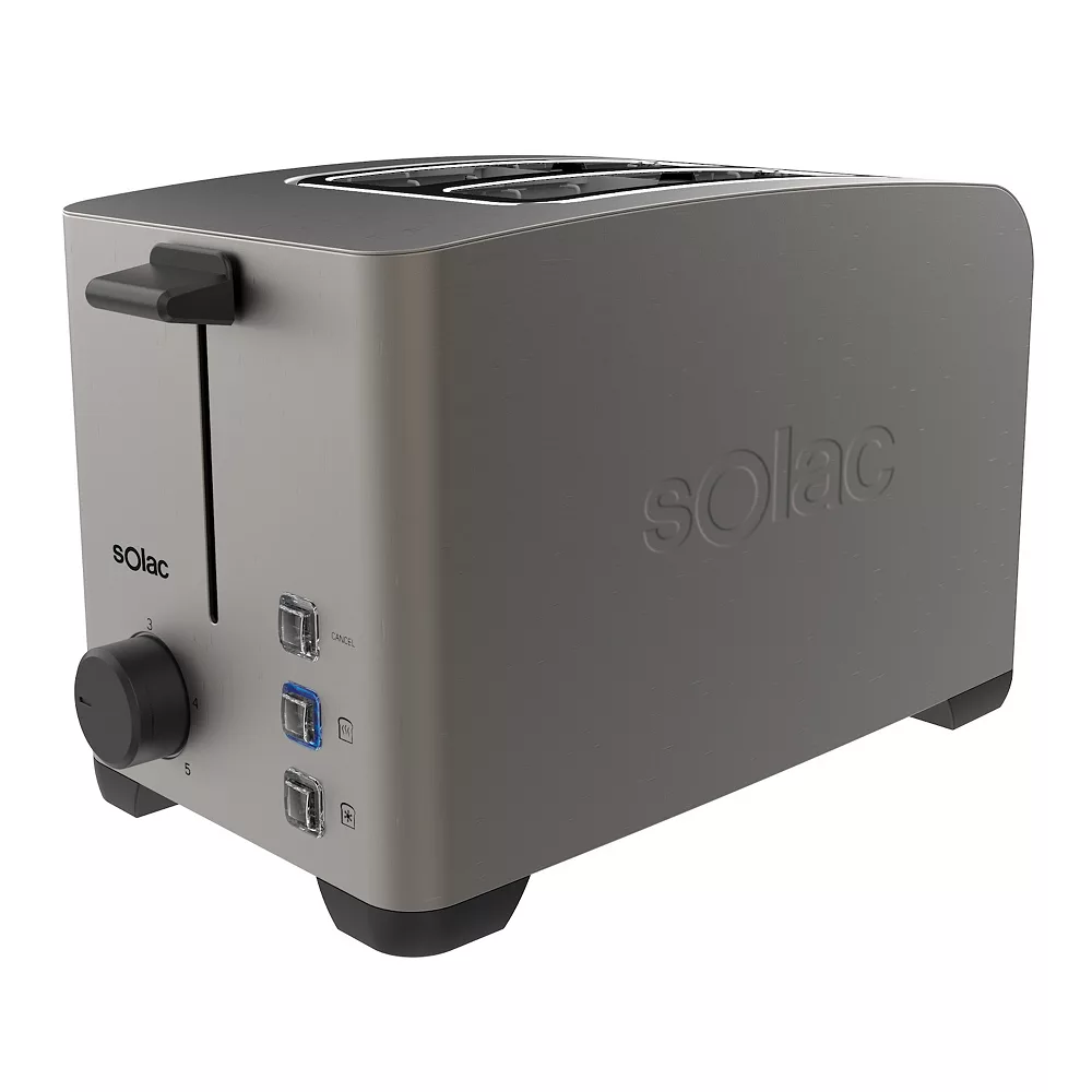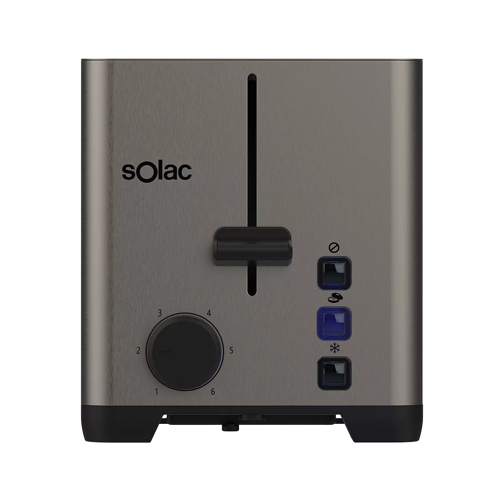 The sleek Solac 2-slot toaster offers both convenience and performance. A dark brushed metallic finish and cobalt blue LED lighting add form and function to any countertop.