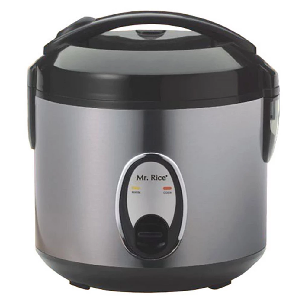 Cook various dishes with this rice cooker. You can steam rice porridge soup stew and much more. Features one-touch operation and convenient carrying handle. Automatically switches to warm mode. Features: Stainless steel body Easy one-button operation Automatic keep warm system for up to 12 hours Cool touch exterior Air-tight lid locks in moisture and flavor Cook and Keep Warm indicator lights Removable non-stick inner pot with Non-Stick coating Added cooking versatility with supplied steam tray Condensation collection cup Safety lock button