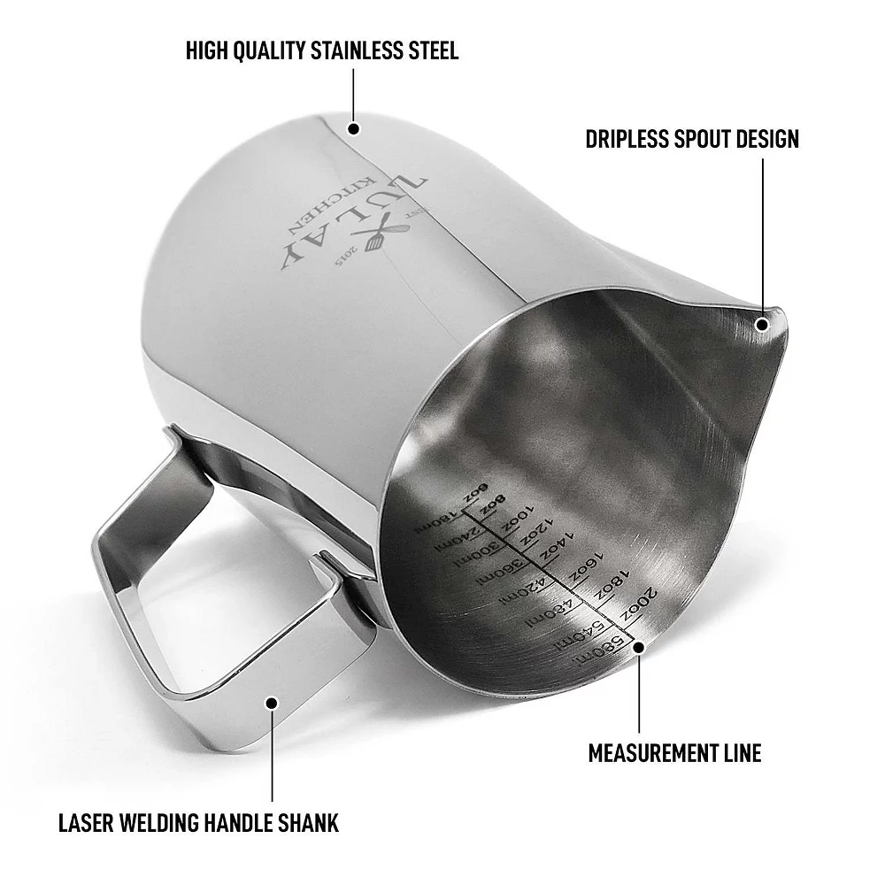 You can use it for frothing milk, measuring other liquids or for serving cream or other beverages to your guests. If you want that creamy latte, hot coco or cappuccino with the foam on top this is the milk frothing pitcher for you. The ergonomic design makes it possible for anyone to use.